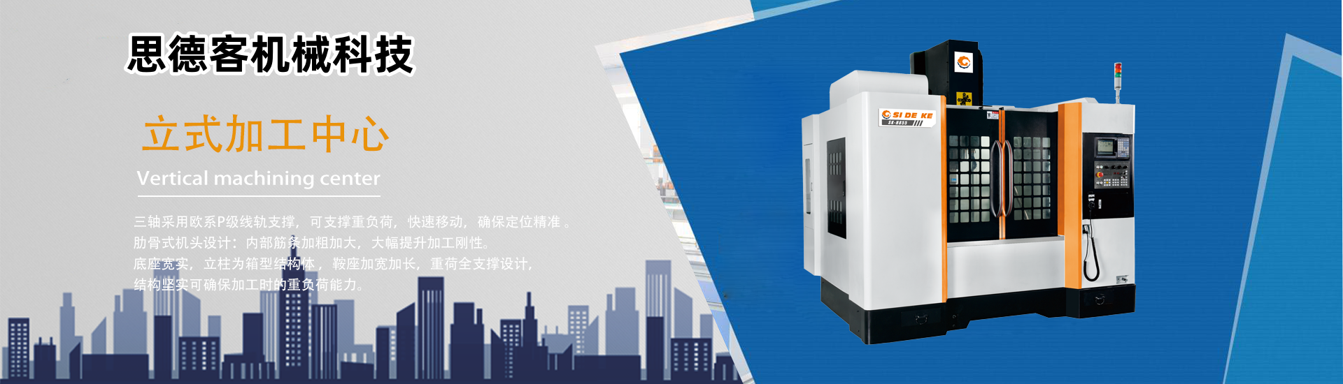 东莞市思德客机械科技有限公司是一家专业从事开发设计、生产製造数控机床的高科技企业,公司融合多家设备生产企业多年的製造经验,不断吸纳国内外同行业的先进科研成果,发展成为今天拥有全新台湾精密龙门导轨磨床、进口双工位卧加、数控镗床、数控龙门、日本叁丰叁次元、英国雷尼绍激光镭射等完善的高端智能装备的全制程生产、装配、检测专业製造商。      思德客CNC加工中心用于各种形状复杂的二、叁维凹凸模型及复杂的型腔和表面,也适用于制造行业的阀类、凸轮、模具、板盘类和箱体类零件的铣、钻、扩、镗、攻等加工工序,更适用于既可用于中小批量多品种加工生产,也可以进入自动线进行批量生产;其具有高刚性、高精度、高速度、高效率、高可靠性、大扭矩等特点;      公司产品有立式加工中心、龙门加工中心机、数控车床系列、钻攻中心系列···